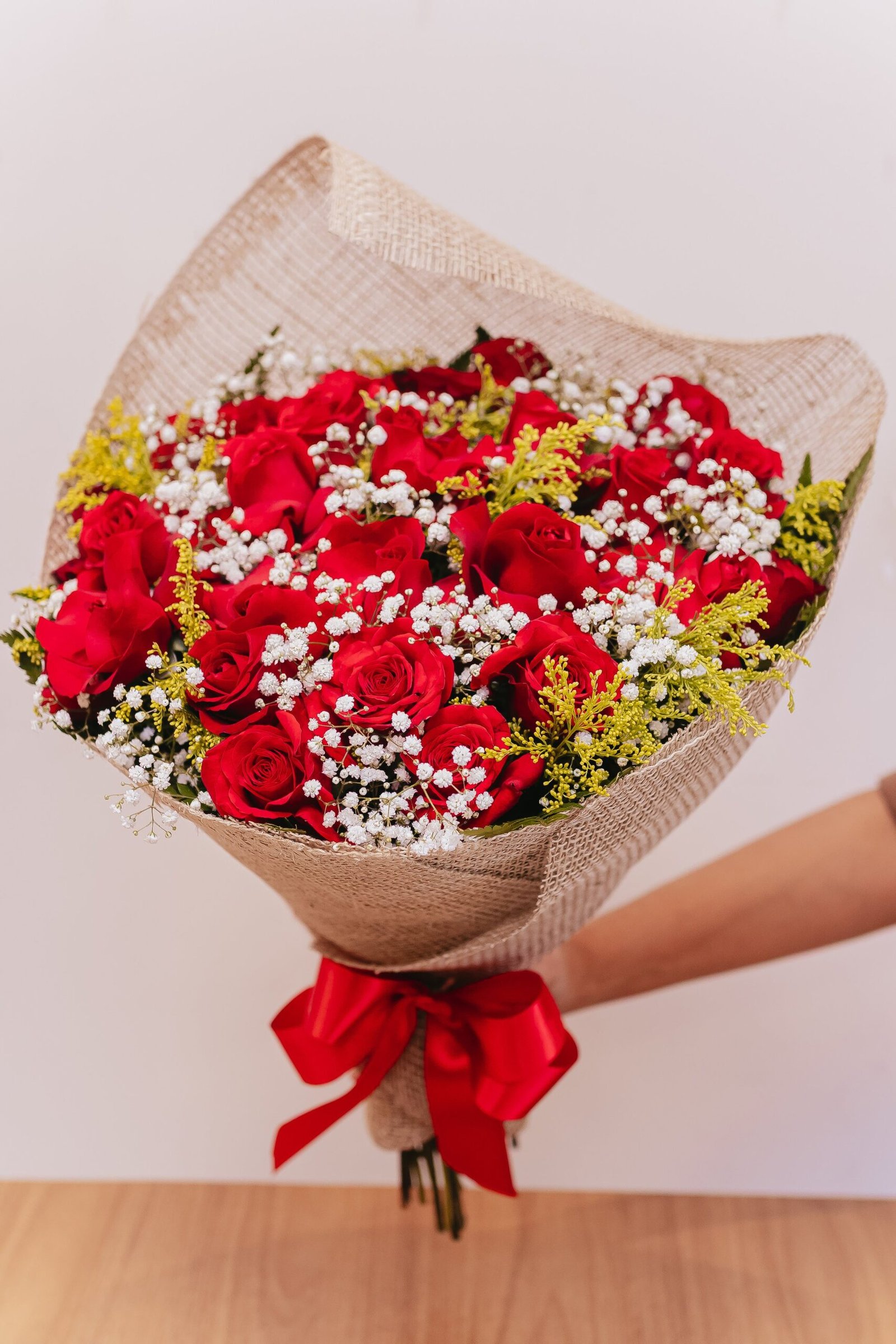 Belíssimo buquê de rosas vermelhas com um embrulho especial de tecido na juta, um embrulho exclusivo para um buquê mais sofisticado, imponente, grande e ideal para surpreender qualquer mulher, a gente sabe que as mulheres geralmente recebe os buquês em ambiente que tem outras pessoas, quanto maior o buquê maior é a surpresa das pessoas que estão à sua volta, isso faz com que a mulher tem um sentimento de ser valorizada, ela vai ficar ainda mais apaixonada por você.